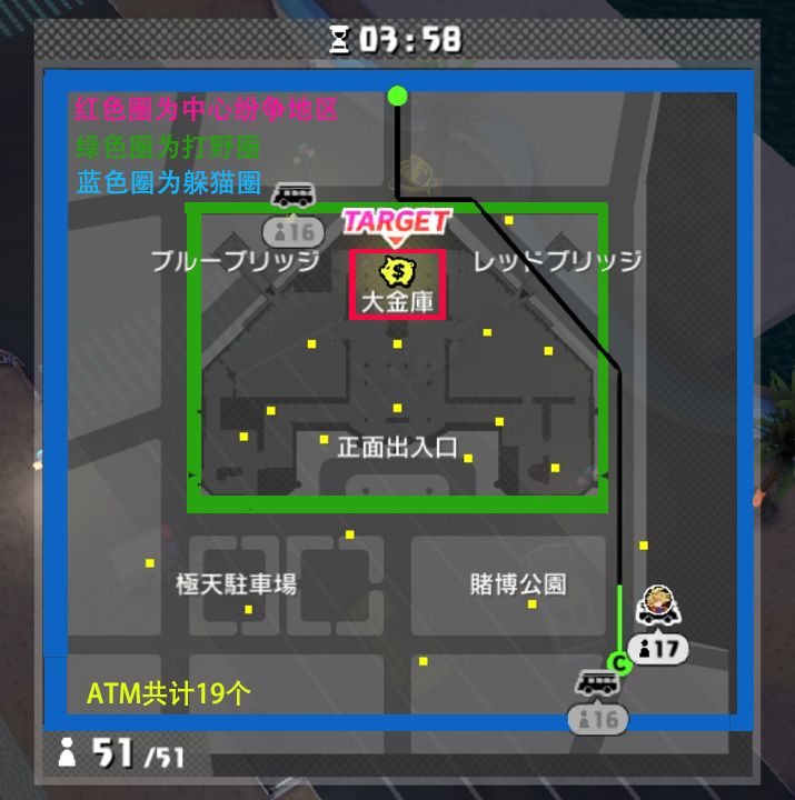 a.红色的中心纷争区域:赌城的金库就在里面,四周精英士兵贼多,光附近一圈全是(5个围着)b.绿色的为赌城打野区域:区域内ATM多,巡逻小兵也有,但是同时也有很多精英士兵,尤其是进入赌城内部的路线都有布置