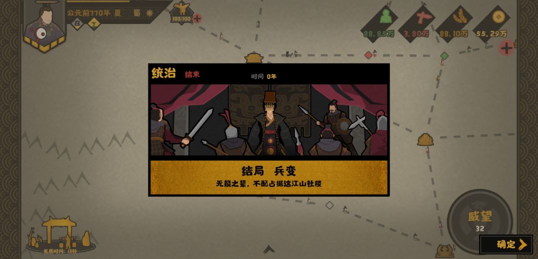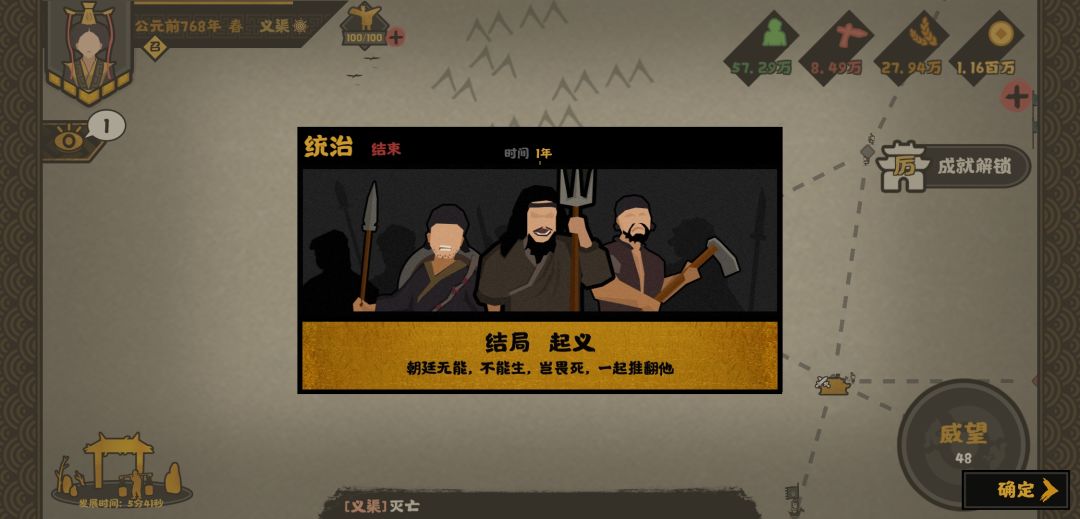 4:起义 众所周知,被起义的你一定是个老暴君了游戏里的百姓还是挺耐折磨的你能玩到起义已经堪比历史上那些老暴君了 触发条件 只剩下一座城民心低于10以下会触发事件如果在事件选择驱赶或者镇压 好言相劝 驱赶则直接去世镇压失败也会直接去世🌝去世之后 如果你要是选择好言相劝的话那你就触发不了 所以前两个随便选一个你就可以获得这个结局了
