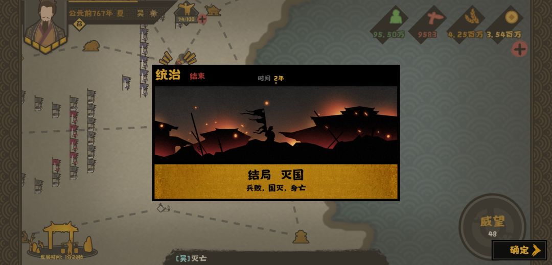 3:灭国 这个呢更简单被别人暴揍致死就完事🤔🤔不过大多数人应该是不会触发这个结局毕竟很多人不会把国家玩到这种程度😂 触发条件就是自己国家被别人灭掉