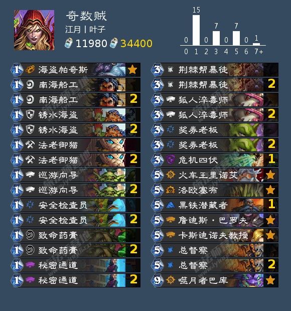 来自 江月丨叶子 的一套奇数贼,他以23-10的战绩打到了国服3000名。构筑上满编总督察针对奥秘法,作者所处分段黑眼较少故舍弃了影袭。新卡安全检查员能够将射手的帕奇斯重新洗回去或者在手牌不好时把药膏或其余卡手牌换回牌库。开通道后安全检查员抽的牌也能继续留着手上。奖券老板在对阵慢速卡组时通常都能招出至少一个33,可以在自己场面丢失的时候补回场面。危机四伏,总督察和黑铁都是针对卡可根据环境自行调整。