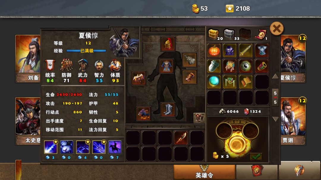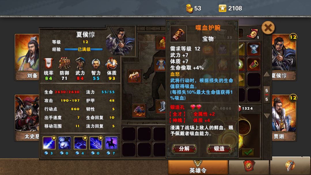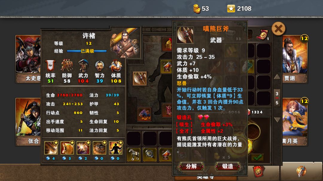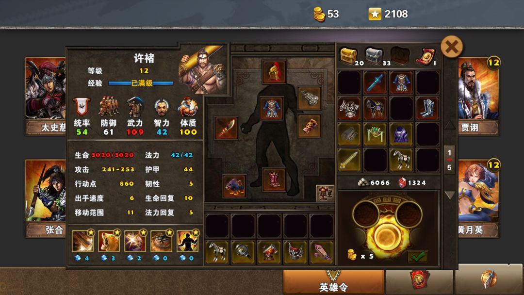 下面是许褚单狼的装备。我记得有次打完马兵没回满血,用了次蛮皮加斧头。