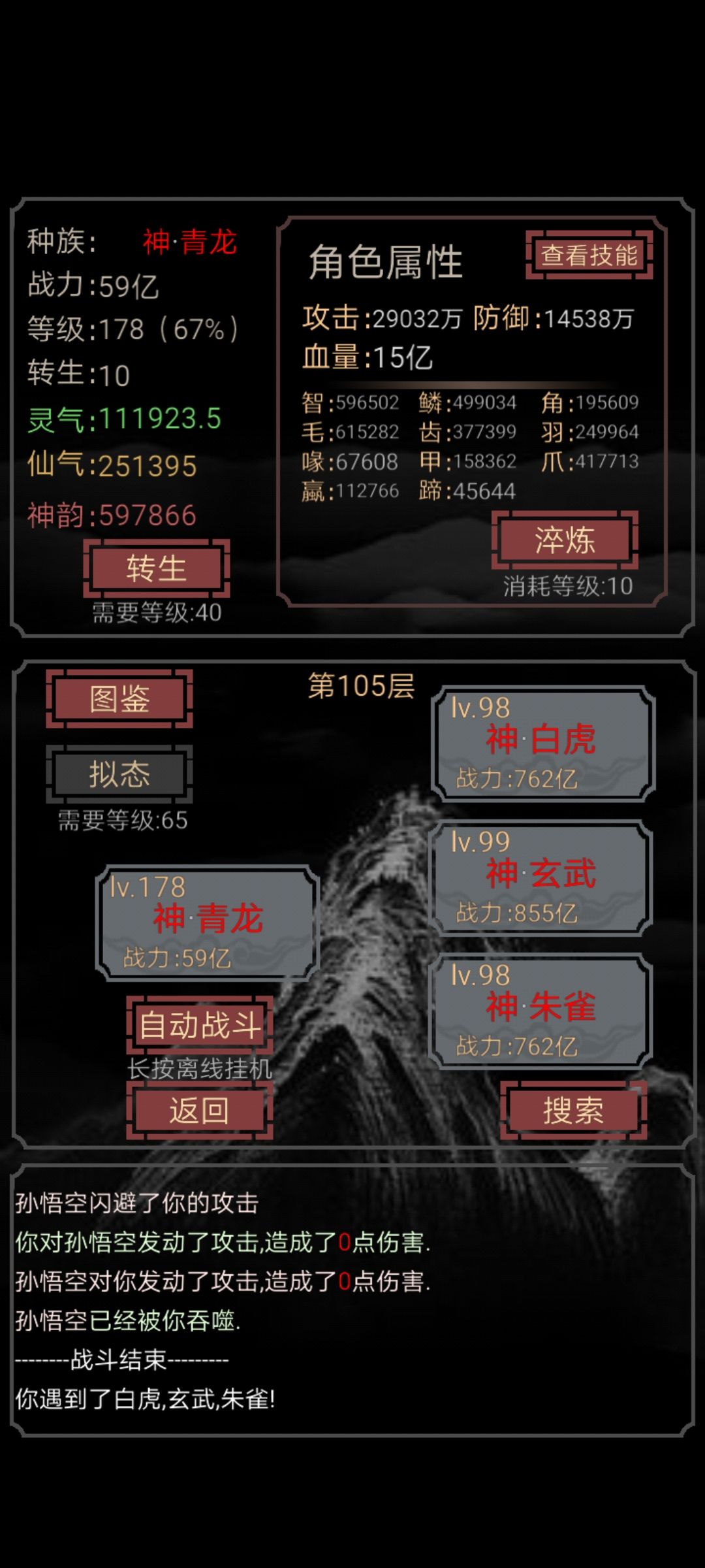 最后龙类,可以刷个五爪金龙碰个龙威,到这里,九个技能了,找个合适的层数开始挂机刷级方便后面洗技能。【由于我这波是十转神青龙,所以五转推荐就是大罗金仙打通关提升挂机时间】