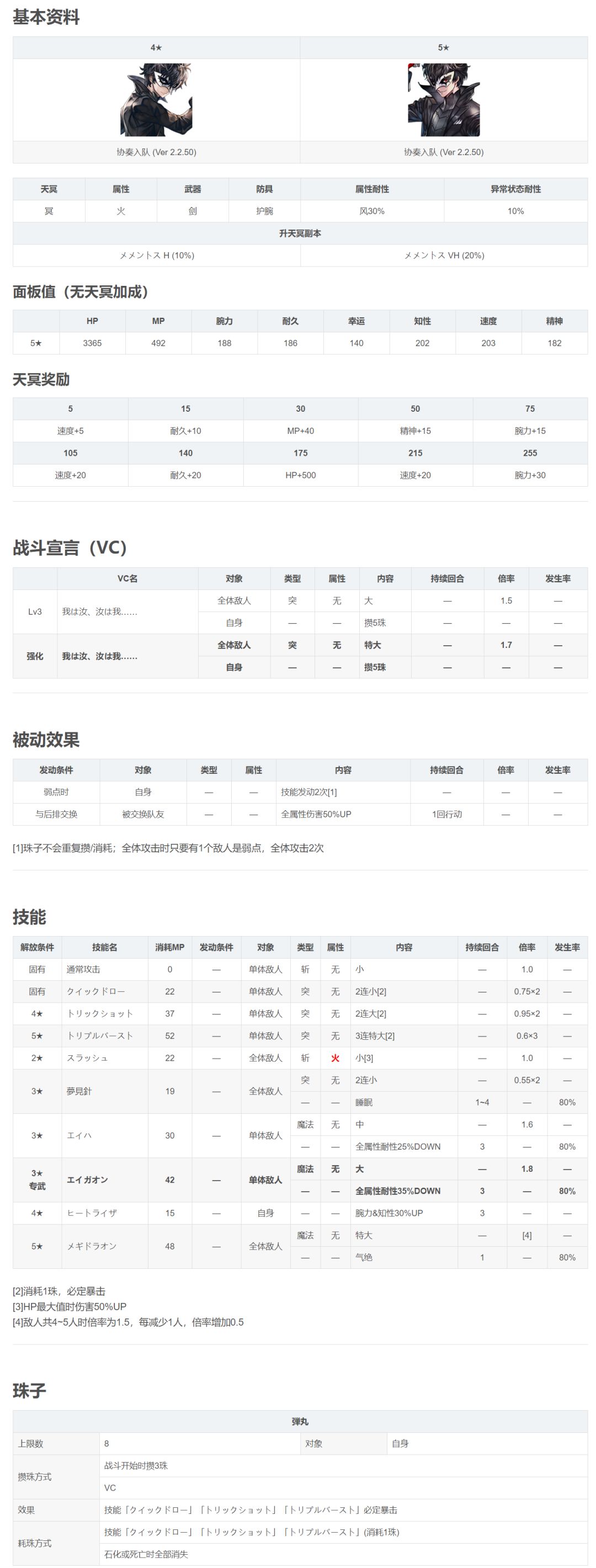 人物的个人页面,以国服下周更新的配布人物Joker为例,从面板值、天冥奖励等的基本资料,到技能说明都可以查看,技能包括倍率和发生率也有详细记载,人物可以攒珠时还会附带珠子的说明。