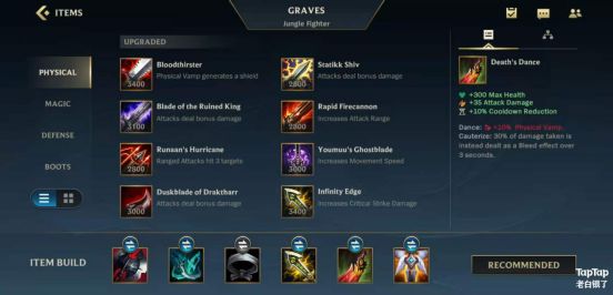 装备方面第一件老白推荐走黑切,这件装备所提供的血量、攻击力、穿甲和减CD对男枪来说都很香。后续两件装备可以选择绿叉和无尽,让男枪枪枪暴击,枪枪六发,伤害爆表。第四件装备可以选择死亡之舞,这件装备不仅可以提供攻击力和吸血效果,还有双抗和爆发伤害转化流血伤害的被动,保命能力和输出兼备。最后一件老白推荐复活甲,到了大后期决战的时候,这件装备的性价比极高。鞋子方面二级可以选择尖牙大嘴的吸血鞋,附魔依情况而定,对面控制多选水银,怕被秒就整个金身。基础部分之后,老白照例带大家来过一段实战。