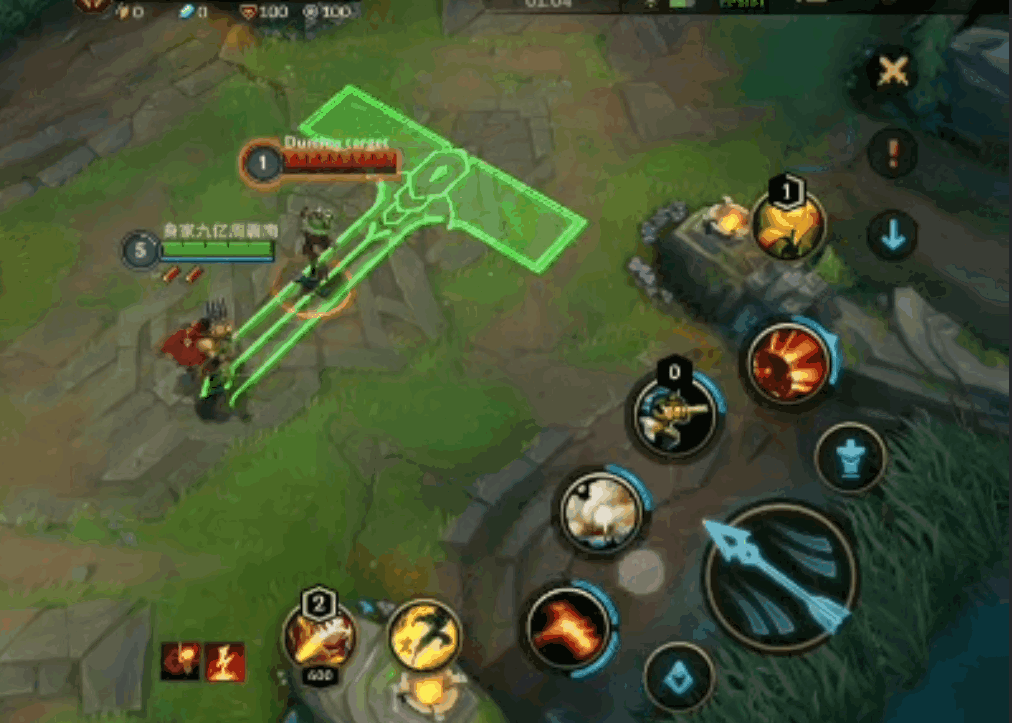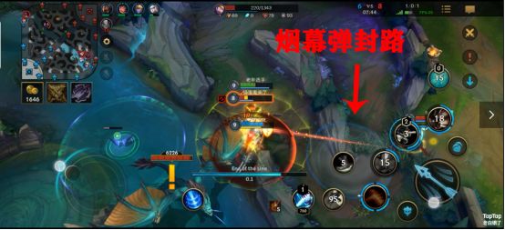 之后老白的队友也来支援,对面放弃追击消失在视野之外,老白先打石头人回复至健康血量,随后转向红buff,遭遇了蹲伏在红buff旁草丛处的对面蛮王,老白先使用2技能让蛮王位于烟雾中,在判断出弹墙无法打中蛮王之后直接朝着蛮王施放1技能。