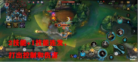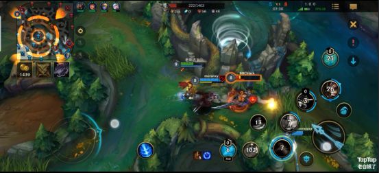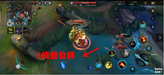 发条无意和我们交手,加速逃回塔下,与此同时对面机器人、维鲁斯和蛮王三人从两个方向出现,和发条一起包夹老白,我果断使出刚才说过的3技能+闪现+大招三段位移拉开距离。