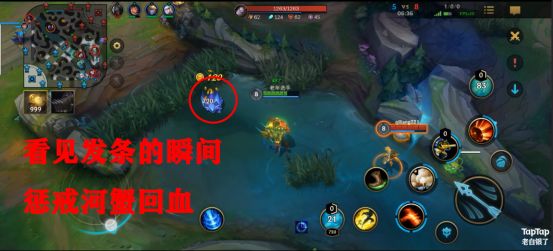 这局游戏老白一方处于劣势,上一波战斗结束之后老白残血去清河道蟹,不料遭遇对面发条,看到发条的一瞬间,老白惩戒河蟹回血,保证自己血量健康的同时防止发条抢掉我们打了一半的野怪。