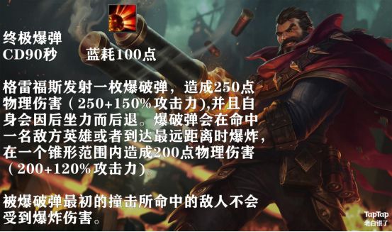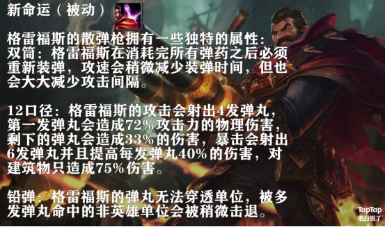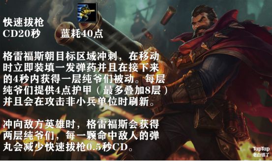 芜湖~小伙伴们大家好,你们亲爱的老白又带着超神攻略回来啦!本期超神攻略的主角,是一枪秒大龙的纯爷们——法外狂徒 格雷福斯!因为手里拿着一支大枪的缘故,格雷福斯一般被玩家称为男枪。闲话少叙,我们先来康康这位纯爷们的技能。