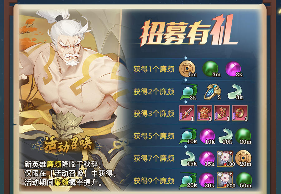 新英雄廉颇降临千秋辞,仅可在限定卡池中召唤获得。