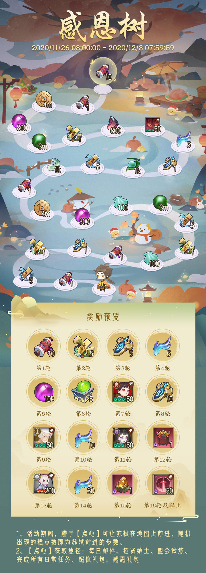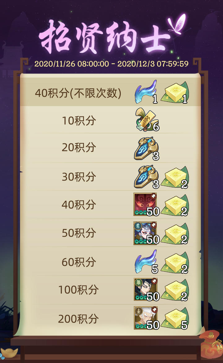 活动期间每日登录游戏可在邮箱领取招贤书*2、点心*2