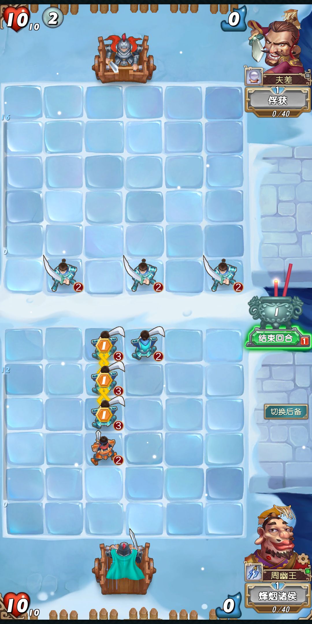 成队情况下最好是直接贴对方主将的脸,这样对手要么移动主将,要么也用一个队伍和你对位,大概率可以消耗对方一个行动点。另外如果你是进攻型兵种如刀和枪,那么对方在不用剑和你对位的情况下,下回合的出击可以赚一个小兵,同理当对面进攻型兵种先成队的情况下,优先用剑队防御。