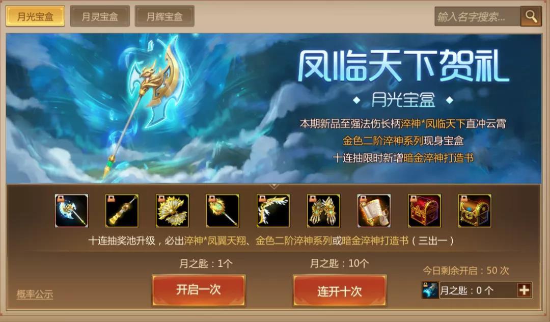 今天就给大家带来第十二期月光宝盒的爆料,并且在更新后,原有的淬神*凤翼天翔正式下架,但保留合成途径。