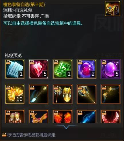 与金色装备自选一样,本期的橙色自选同样沿用了第十期的橙色装备自选,其中包含了神之武器打造书页、拘魂水晶、聚灵石等奖励。