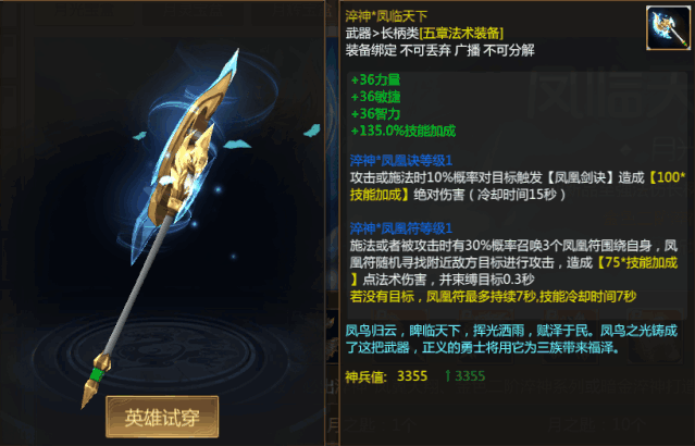 作为二阶淬神的进阶,淬神*凤临天下不仅拥有炫酷的外观,更是拥有强力的技能,持有者在使用该武器时,不仅有概率对目标出发绝对伤害,并且在施法或者受到攻击时,有几率召唤凤凰符对周围目标进行攻击。