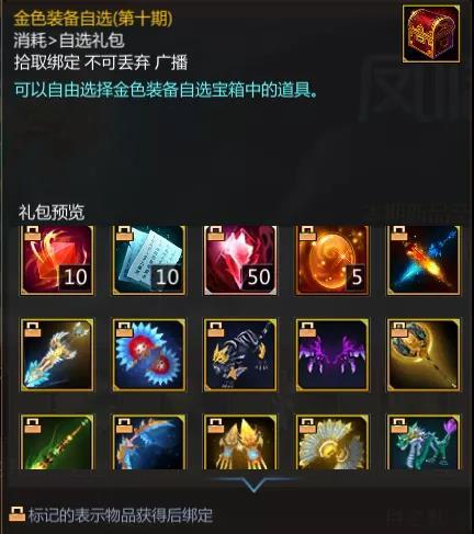 第十二期中金色装备自选依旧使用第十期的奖励,其中包含了能源石、拘魂水晶、神之武器打造书页、焚神凝殇、四圣兽五行翼等奖励。