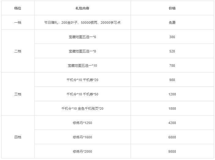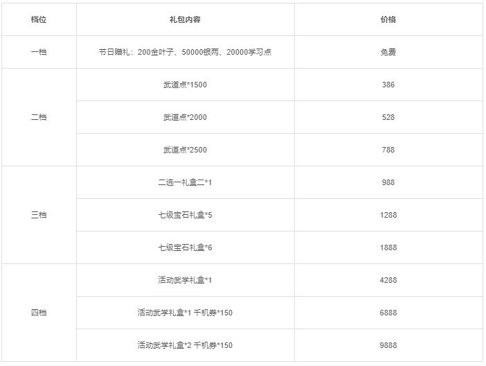 *【活动武学礼盒】:打开后可在断弦三刀、电光一字剑、劈空掌、暴雨梨花针、乘风蹈海、春阳融雪功、250千机券中选择一个获得。
