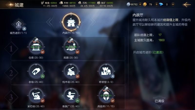 1、将“内政厅”升至10级,解锁“城市进阶”,接着将兵营升至20级,转头升满“统驭”科技。