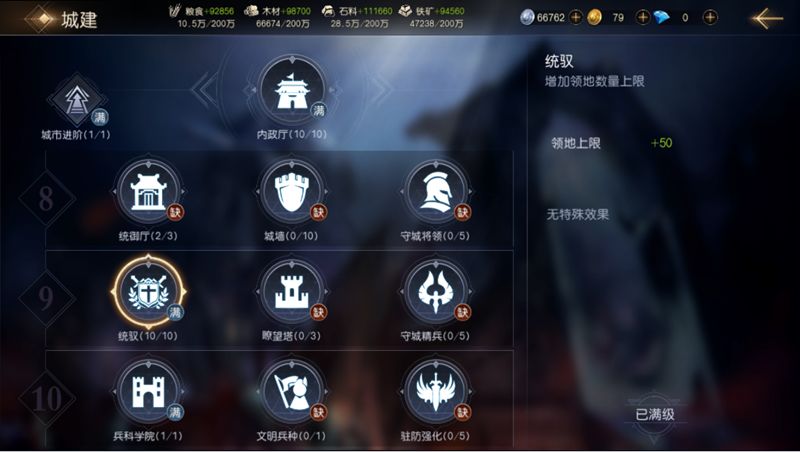 不论是走哪条路,等将“统驭”跟“兵营”升满后就没啥要讲究的了,按照历程升级建筑多赚点声望增加几块领地数即可。