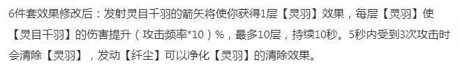 改成了每层提高会有的影响是你如果在刷图的时候断了灵羽的被动的话会有一两秒的伤害下跌,比之原来的话是稍微弱了一丢丢,但是这个数值的提高完全吧这点弥补了,而且改成攻速增加灵羽了以后,叠层2.5秒就可以叠满了,所以加强的相当大