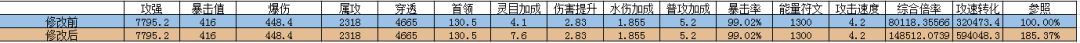 普攻伤害没变,但是灵目千羽伤害加成翻倍了,不过要综合上灵目伤害本身的100%,并没有翻倍,我们在没有武器灵魂链接的情况下算算看