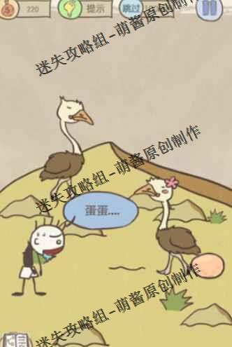 为了帮助主角顺利吃到鸵鸟蛋,我们需要用上一些工具,各位看见主角上方的沙坑没,将沙坑点开,接着拖动主角将主角移开,会发现里面有把铲子,再将铲子拖动到守着鸵鸟蛋的鸵鸟面前,挖个沙坑,鸵鸟就会把头埋进沙坑里,这样主角就能吃到眼前的鸵鸟蛋了。
