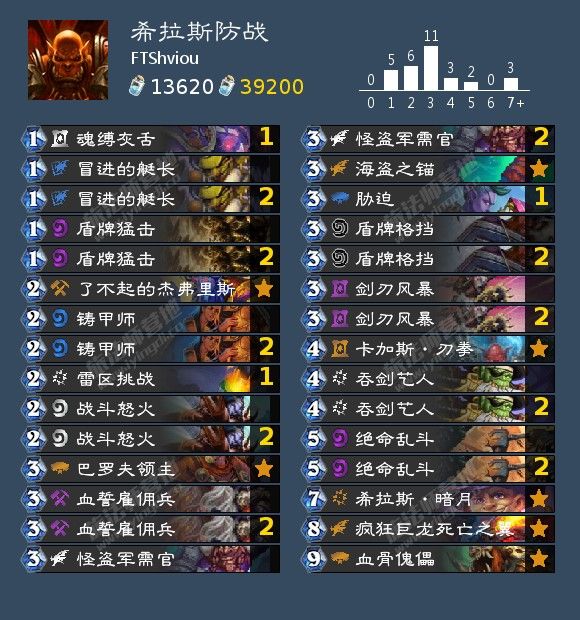 来自天梯玩家FTShviou国服第九的一套希拉斯防战。这个版本的防战相较上版本而言变化不是很大,吞剑艺人作为强力的海盗基本取代了之前狗软的位置,而雷区挑战虽然是前期非常优质的单卡,但中后期相对鸡肋,由于卡位原因只带一张。防战可以考虑像glory的暗月战携带比如砍劈课程之类更多的过牌,但携带肉肉的版本可能更适合当下的国服环境,在内战中也有较好的发挥。