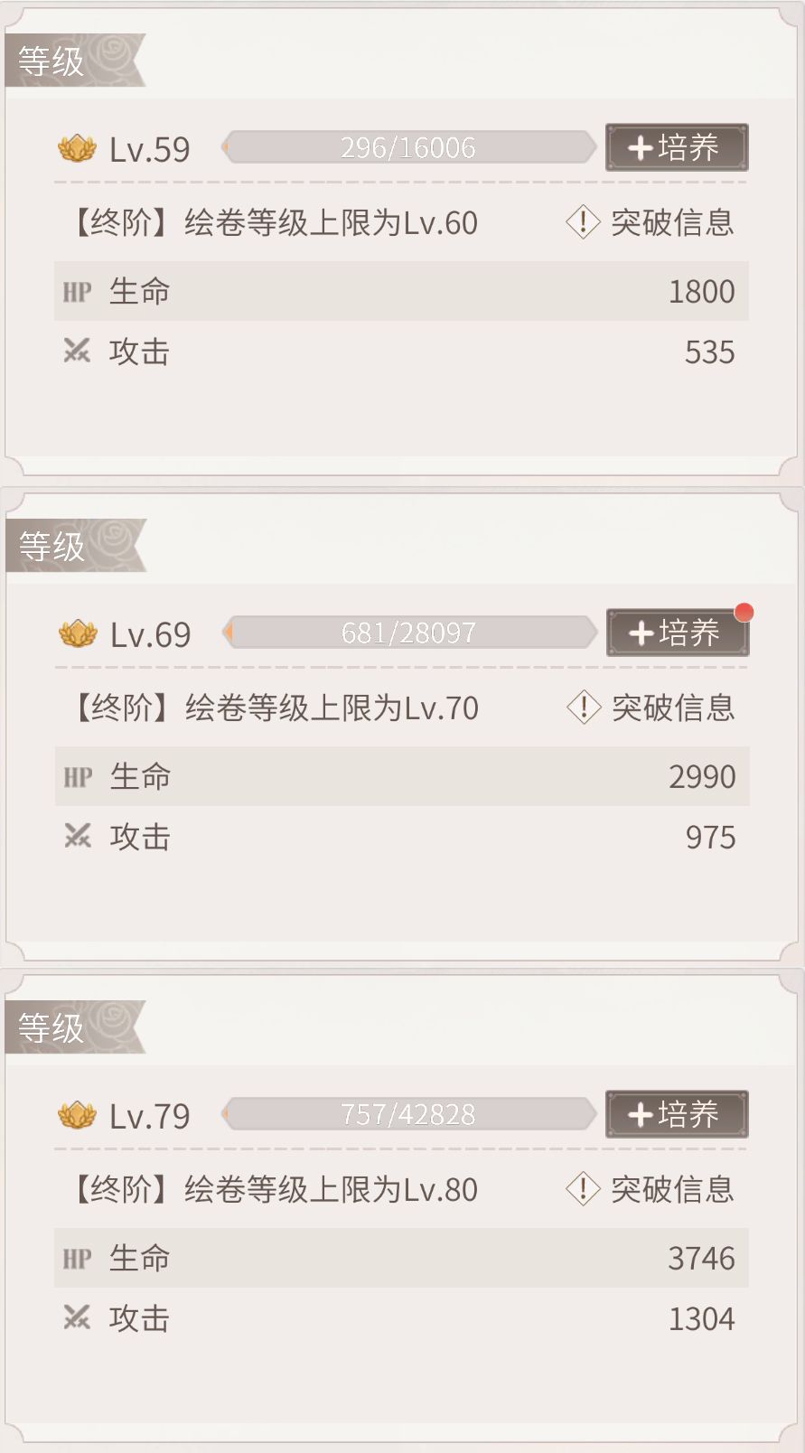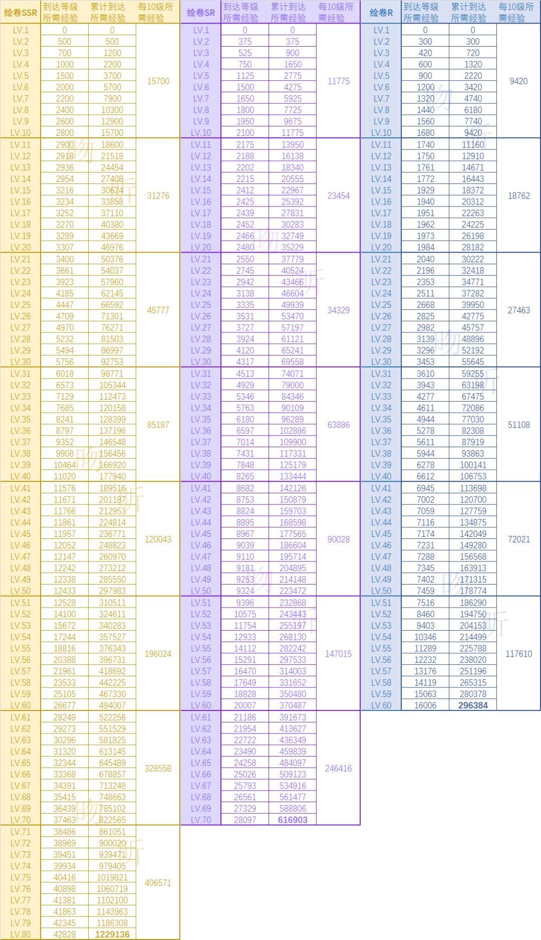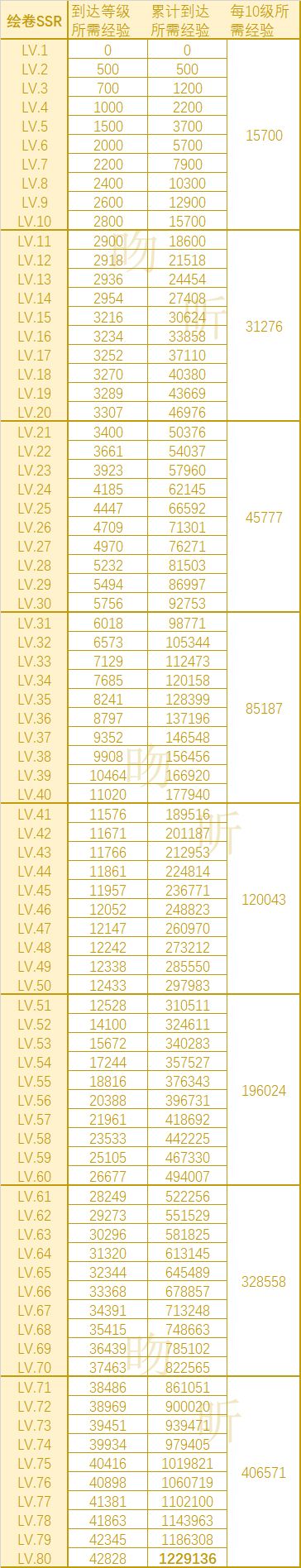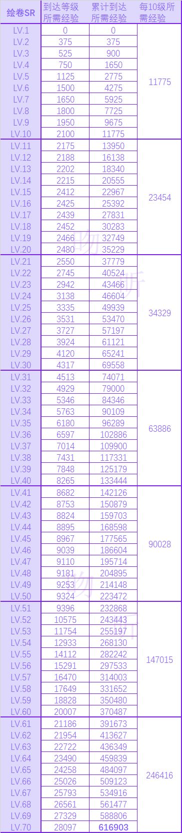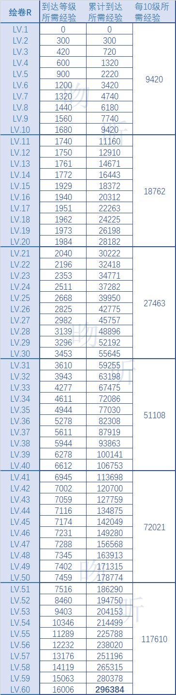 绘卷升级所需经验统计