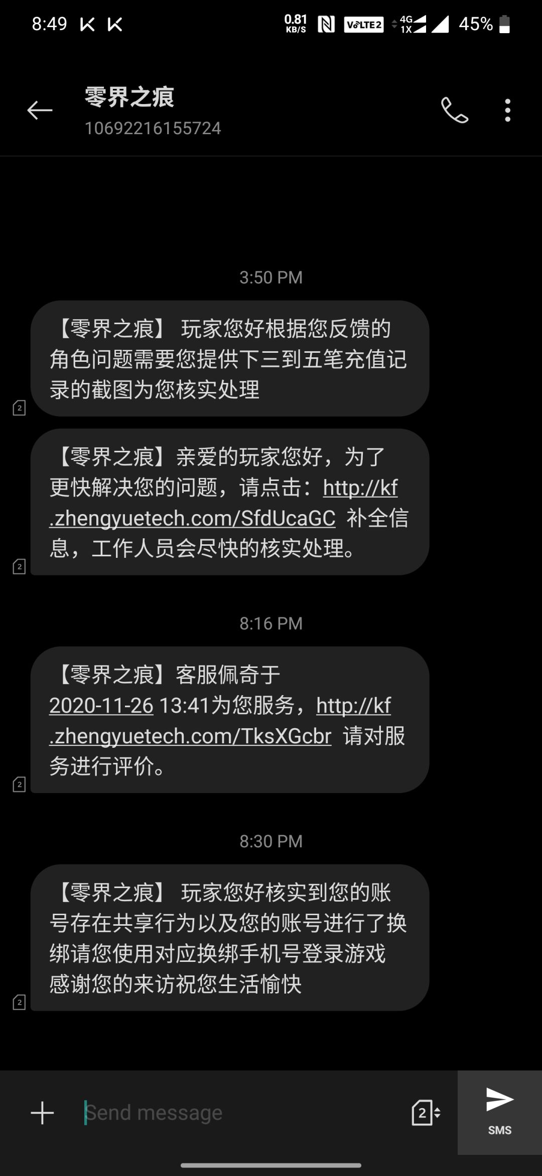 开始用自己的联通手机号开的,25号凌晨维护完以后,再登录,提示让我实名认证(之前已经认证过),然后就莫名其妙换绑到我移动号码(询问客服后得知)。好吧,还能玩,当作无事发生,半夜领个福利过个任务。然后今天再登录游戏(用移动的号),又让实名认证,然后一样的剧情,号又没了,和客服墨迹半天,告诉我技术要核实,然后发短信让我上传了充值截图。今晚短信通知我是自己换绑的?? 还有没有相同遭遇的小伙伴?