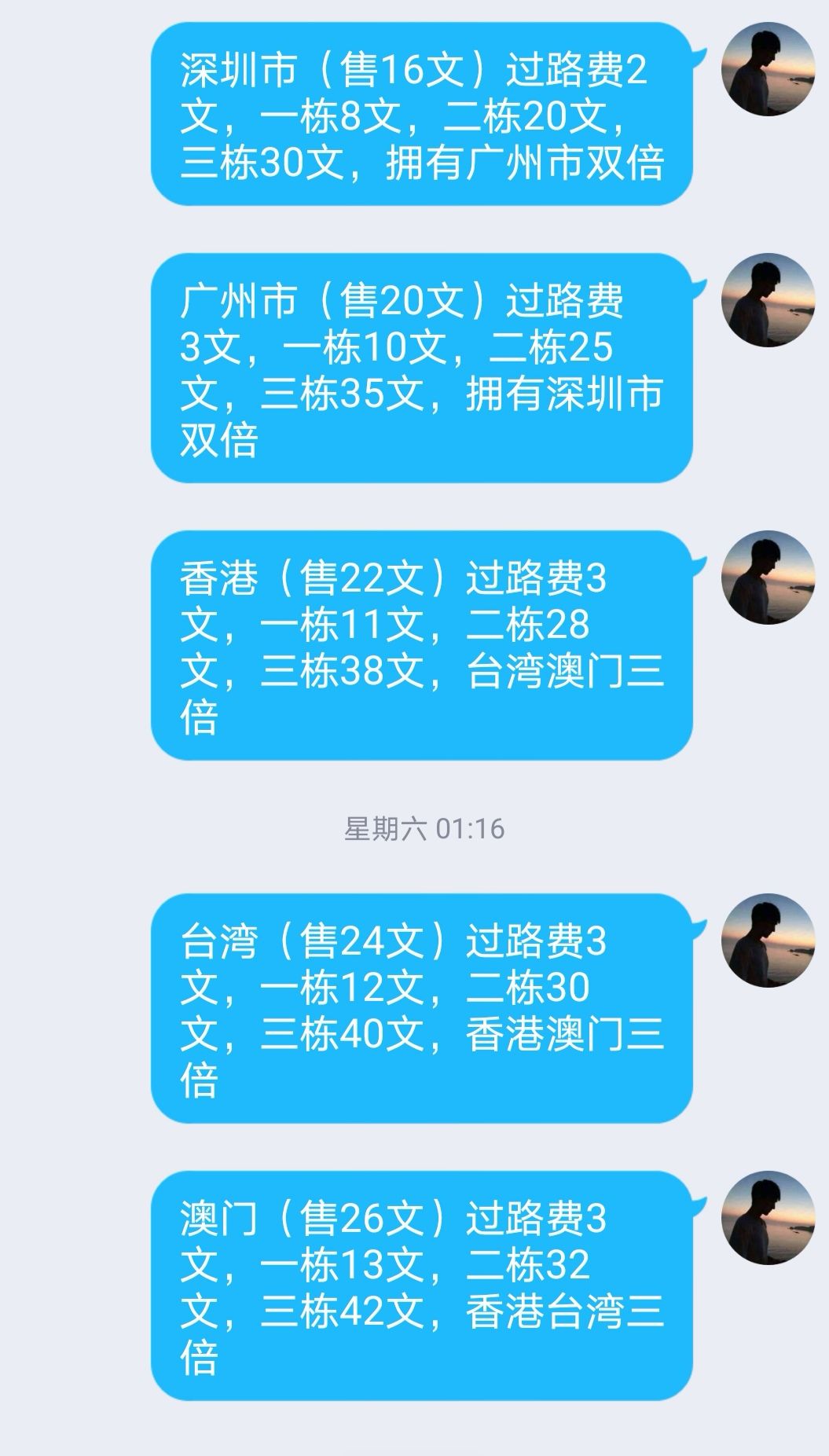 例如:深圳市(售16文)过路费2文,一栋8文,二栋20文,三栋30文,拥有广州市双倍