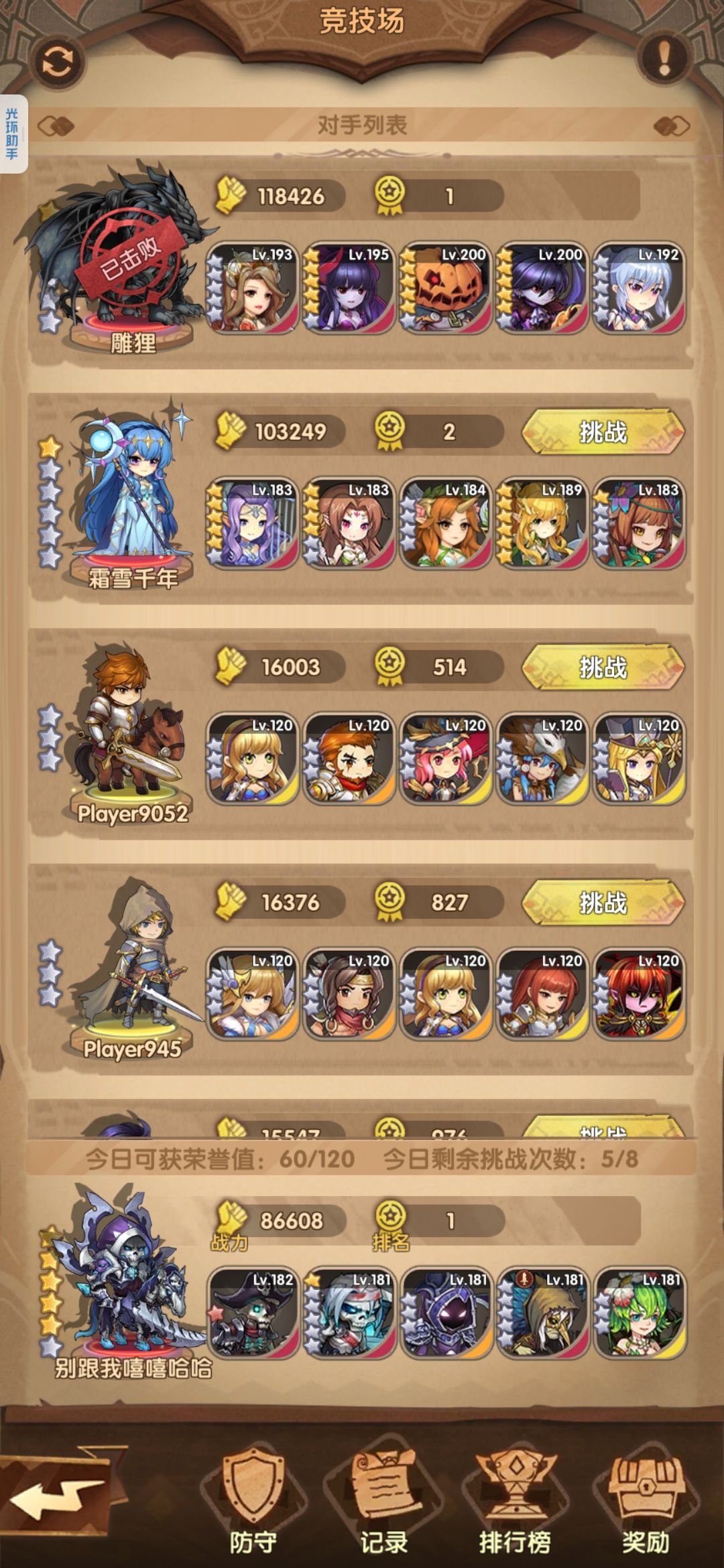 如图,练度差距大等级低装备差一些也可以搏一搏,这游戏已经卦机好久无聊到爆,四个种族全开了也没啥可玩的点,之前培养的国家队啥的竞技场也就三四十位置,主要也是没动力也不怎么愿意打,绞肉机练度也完全是为了龙城多一个输出,最近突发奇想想增添一些乐趣搞点幺蛾子,就是如图这种"借尸还魂"召唤流,完全是赶鸭子上架只把等级顶上去了,完全没有羁绊(可以凑战士),技能开的七七八八,装备也全是捡的之前培养过得角色用的装备,一般对抗常规龙骑,个别真祖阵容不太虚,怕的就是那种黑龙啥的群体技能,好在练度足够抗住一次大招,城堡也能把血线提上来一些,说实话没指望到这个阵容表现多么好