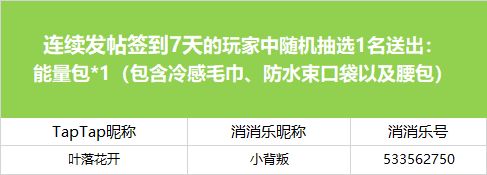 ■连续签到7天以上的玩家中随机抽选1名送出:能量包*1(包含冷感毛巾、防水束口袋以及腰包)