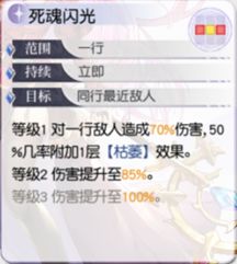 安洁儿,SSR,奥义附件一层“枯萎”(需升到2级),普攻和绝技几率添加一层“枯萎”。虽然是SSR,但登录活动第二天送,无入手难度。