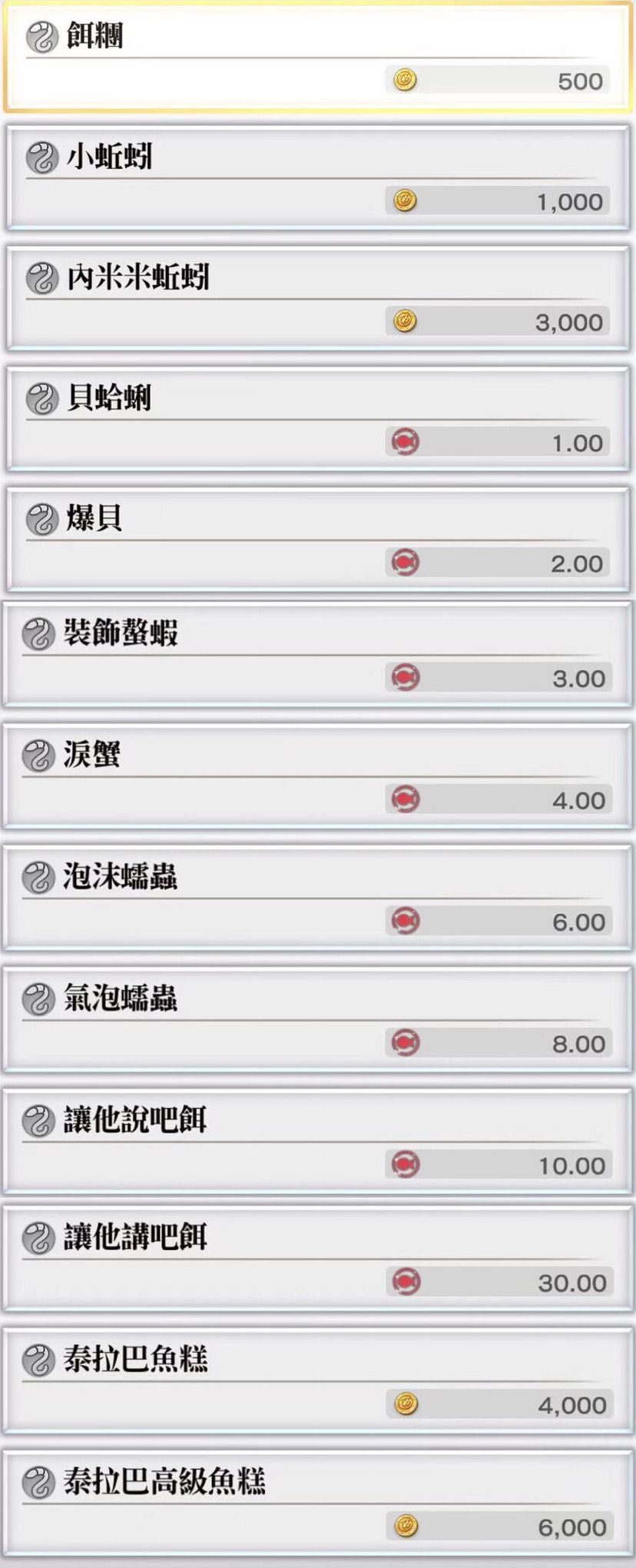 鱼饵从图中可知也分好多种 需要花金币的只有5种 分别是500 1000 3000 4000 6000 以及用鱼点换的