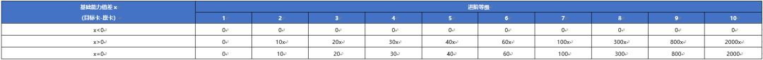 Ø 当原卡基础能力值小于转移目标卡时,可选择不消耗转移点数的免费转移,但会导致进阶等级下降1-2级;如果不希望进阶等级下降,则需要消耗一定数量的高级进阶转移点券,需求量如上表所示;