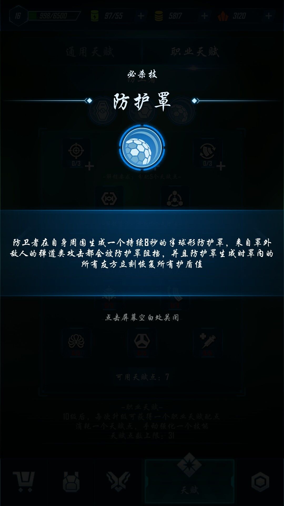 防护罩:8秒防护罩,防护弹道类攻击、恢复队友防护值。只要防卫者护盾打开,就一定要站进防护罩里面去,及时补充防护值。当然防卫者不要在队伍后面暗戳戳把防护罩打开,请冲到队伍中打开护罩。防护罩只有8秒,每一秒都不可浪费。