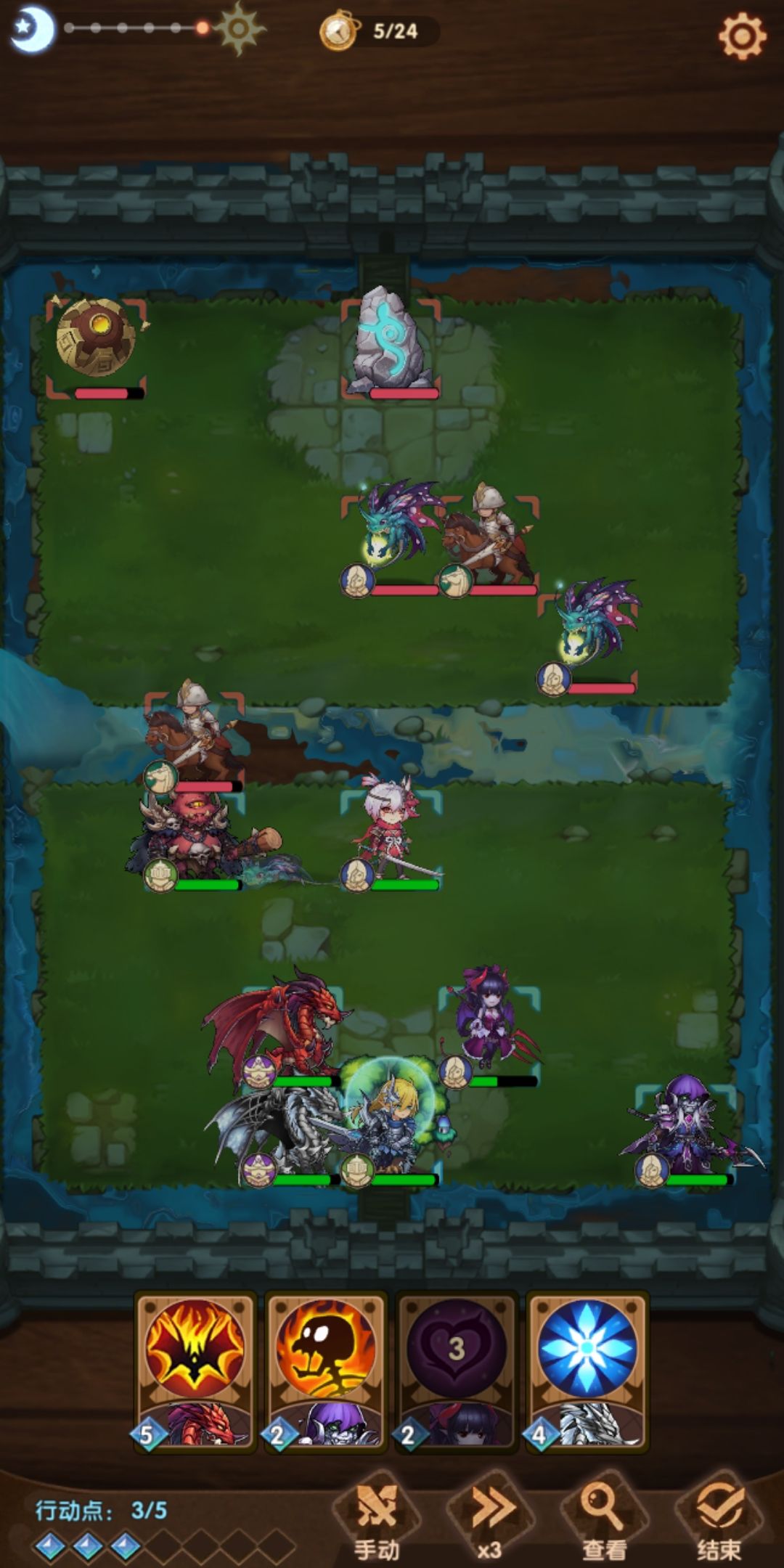 最后小结一下精灵龙关卡的一般通关思路。除了特定关卡会遇到开局死守王座的精灵龙外,如20-8,一般关卡里面的精灵龙都会选择在第一回合先手冲击我方后排。面对这种情况,都可以如上述20-6开局布阵那样,设下围杀精灵龙的陷阱,快速集火掉深入敌阵的精灵龙,接着各个击破。