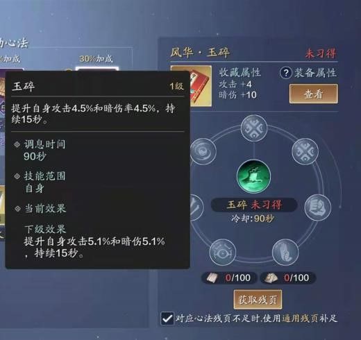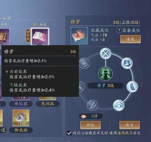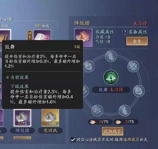 当少侠到了游戏后期有条件的情况下,还是逐步将心法替换为全金色品质。因为唐门主属性为气劲,所以二号位为炼武气劲,三号位为悲回风,四号位为御长凝,尽可能多的提升气劲属性加成,推荐配置为: