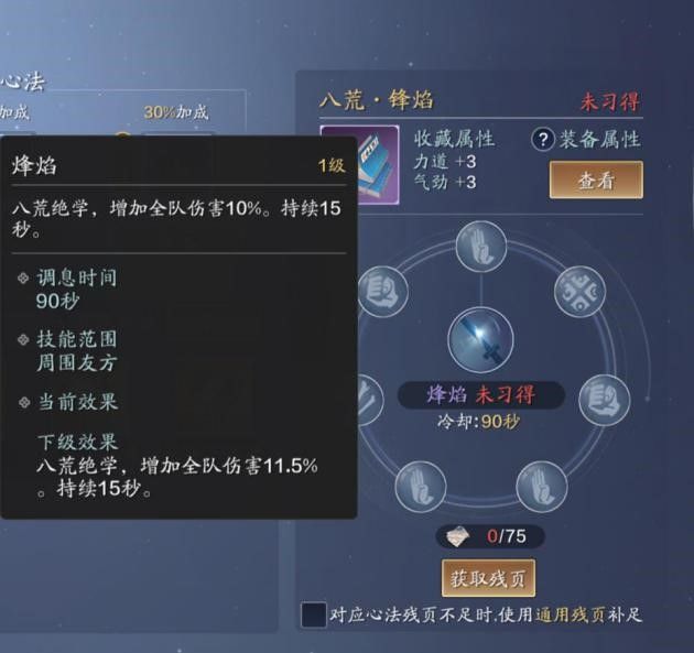 到了后期的心法选择上,三个提升伤害的紫色心法仍然可以保留。而主动心法的万流归宗可以替换为八荒烽焰,可以同时为自己和队友提升伤害,队伍打怪效率UP!
