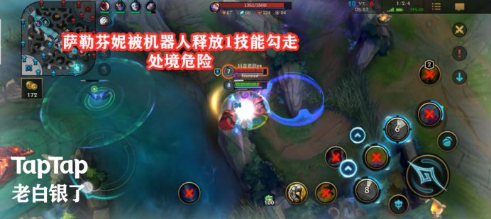 首先我们可以看见,我方萨勒芬妮在试图往敌方野区布置视野的时候被敌方机器人1技能逮到,处境危险。