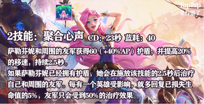 不过这个2技能有利也有弊,它的CD事件非常非常长,所以大伙在用小萨辅助的时候,记得多多关注队友的血条,在危机时刻灵活运用这个2技能。
