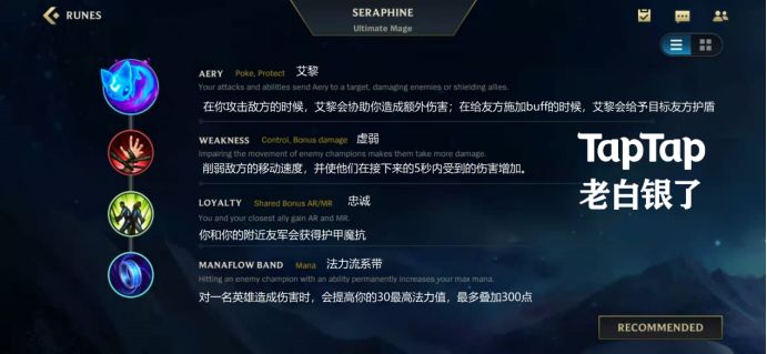 符文选择伤害护盾皆有的艾黎,帮助友军造成伤害的虚弱,给友军增加护甲魔抗的忠诚,以及为自己增添蓝量的法力流系带。