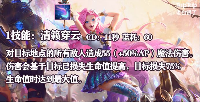 其实最开始,Riot给萨勒芬妮的定位是一位有盾有控有输出的AP中单英雄,但我老白是何许人也?你让我去中单,我就去中单?万一我被小鱼人劫阿卡丽这样的刺客杀穿了,那我岂不是很没面子?所以老白今天另辟蹊径,把萨勒芬妮从中单位换到辅助位,试图利用她高额的AP加成打穿AD的心态。(指敌方AD,老白像是那种K自家AD人头的人吗?)国际惯例,在进行攻略解说前,让我们先来看看小萨的技能是什么——
