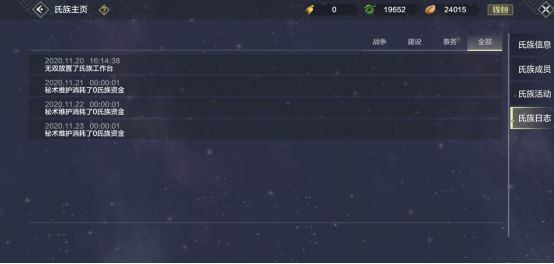 有战争,建设,事务,全部,战争属于宣战,可向敌方宣战,敌方也可向你宣战。建设属于制造,研发秘术。事务属于捐献之类的记录。全部的话就是以上所有信息的集合了。