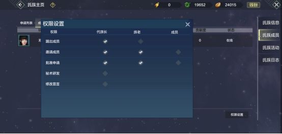 氏族成员: 氏族成员可以看每一个氏族成员,而且有权限设置,可以给氏族成员委任代族长,族老,这些管理员的权限全部由族长分配(见下图)。成员列表旁边是申请列表,可以同意或者拒绝,也可以选择自动接受,这样就比较简单方便。