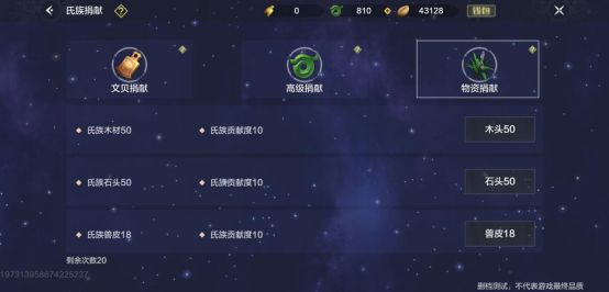 有【文贝捐献】,【高级捐献】,【物资捐献】,捐献数量不同,所得到的资金以及贡献也不同,刚开始的话还是以物资为主,多捐献的话可以制造氏族商店,工作台之类的氏族灵器。而且物资捐献的话也是比较简单的,基本都是以石头,木头,兽皮为主,不过所获得的资金以及贡献较少。