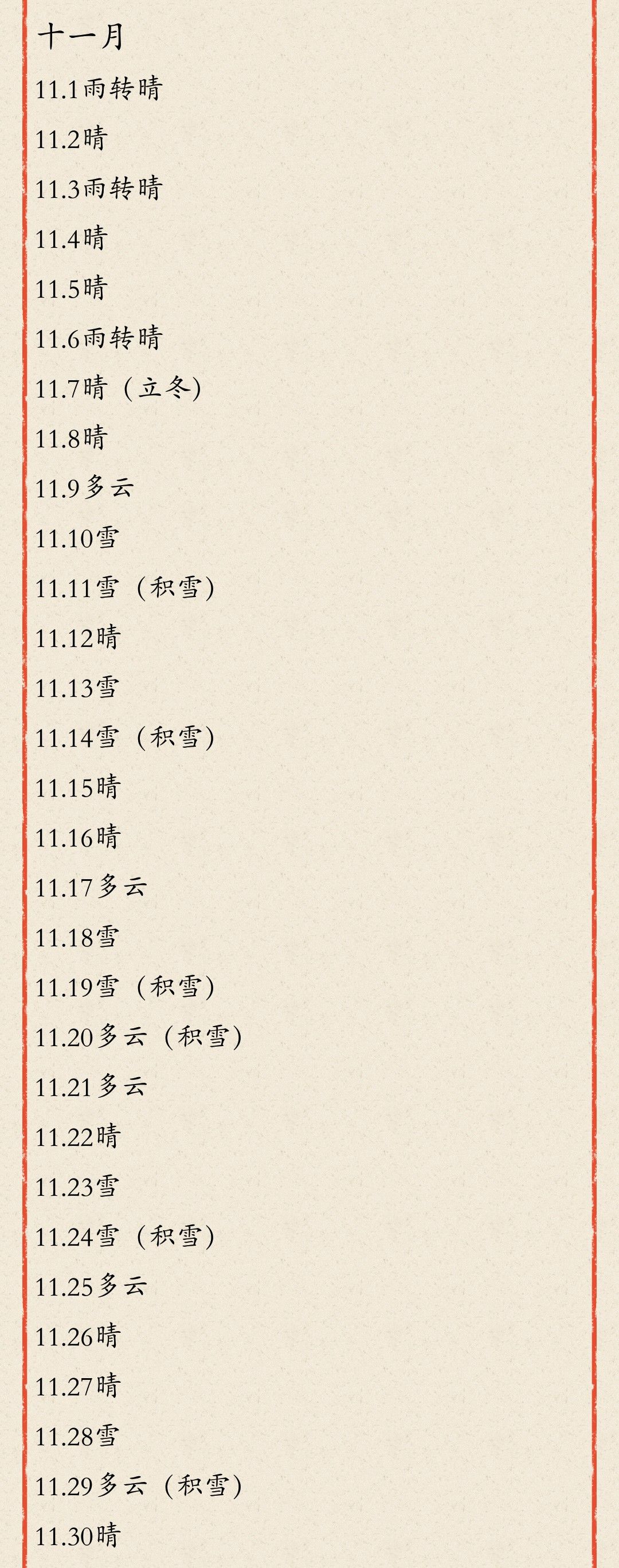 十一月天气统计新鲜出炉啦!