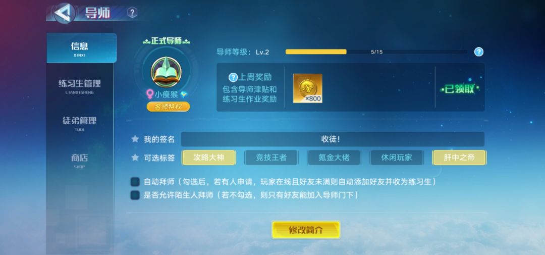 收徒(希望能收长期活跃(意思是活跃到满亲密度出师为止)的徒弟)