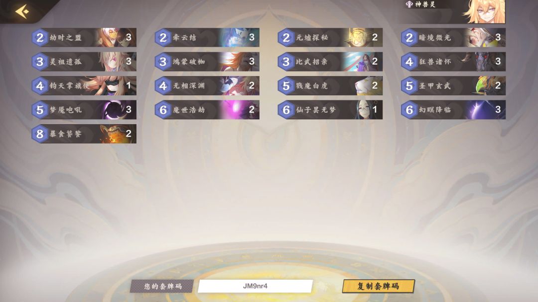 谭无梦 优质奶卡+站场,用于斩杀组件未齐时的苟命加解场,配合无相深渊或幻冥降临可以反复使用,我带了一张,可不带,建议0-2