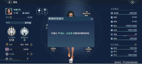 1:打开人物面板,点击阵营那栏旁边的感叹号(西山指当前阵营;冶业官是离可以换阵营的衙门最近的公交站)