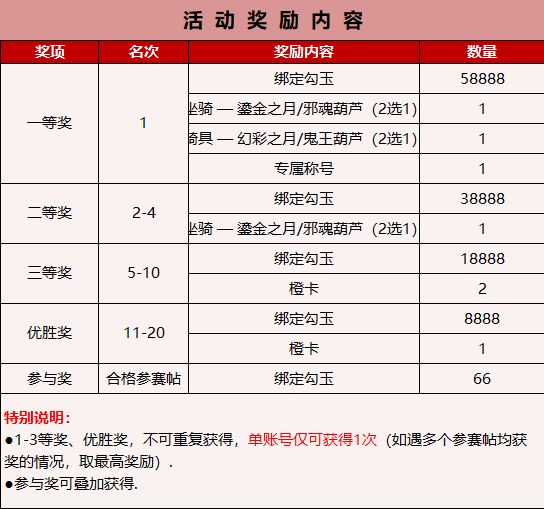3.奖励规则:武者按照参与方式要求参与,帖中无违规内容,活动结束后,回复数+浏览量之和排名前7的武者&项目组投票前3的优秀作品进入复赛,复赛由玩家投票决定最终名次!在获奖名单正式公示后,联系送出奖励(武者们的大量回复整理阅读需时较长,预计在2021年1月5日前公布);